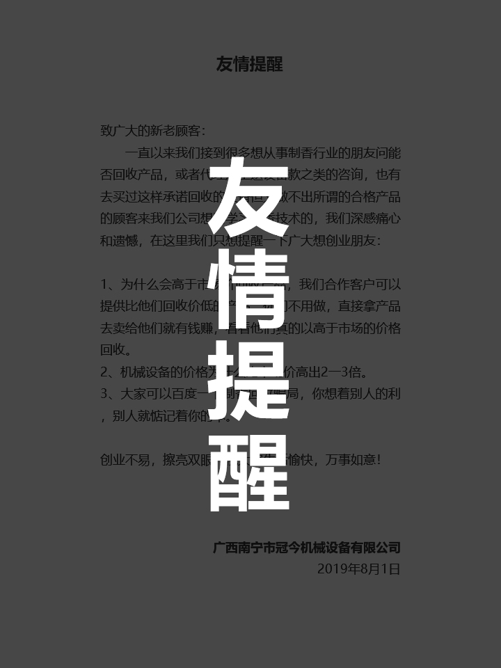 購買冠今制香機,享受八大保證,讓您創業無憂!冠今制香機八大支持保證系統:強力支持 后顧無憂 1.現場觀摩:免費在制香廠里參觀各種香生產流程,滿意后再做決定。 2.專業培訓:購制香機...